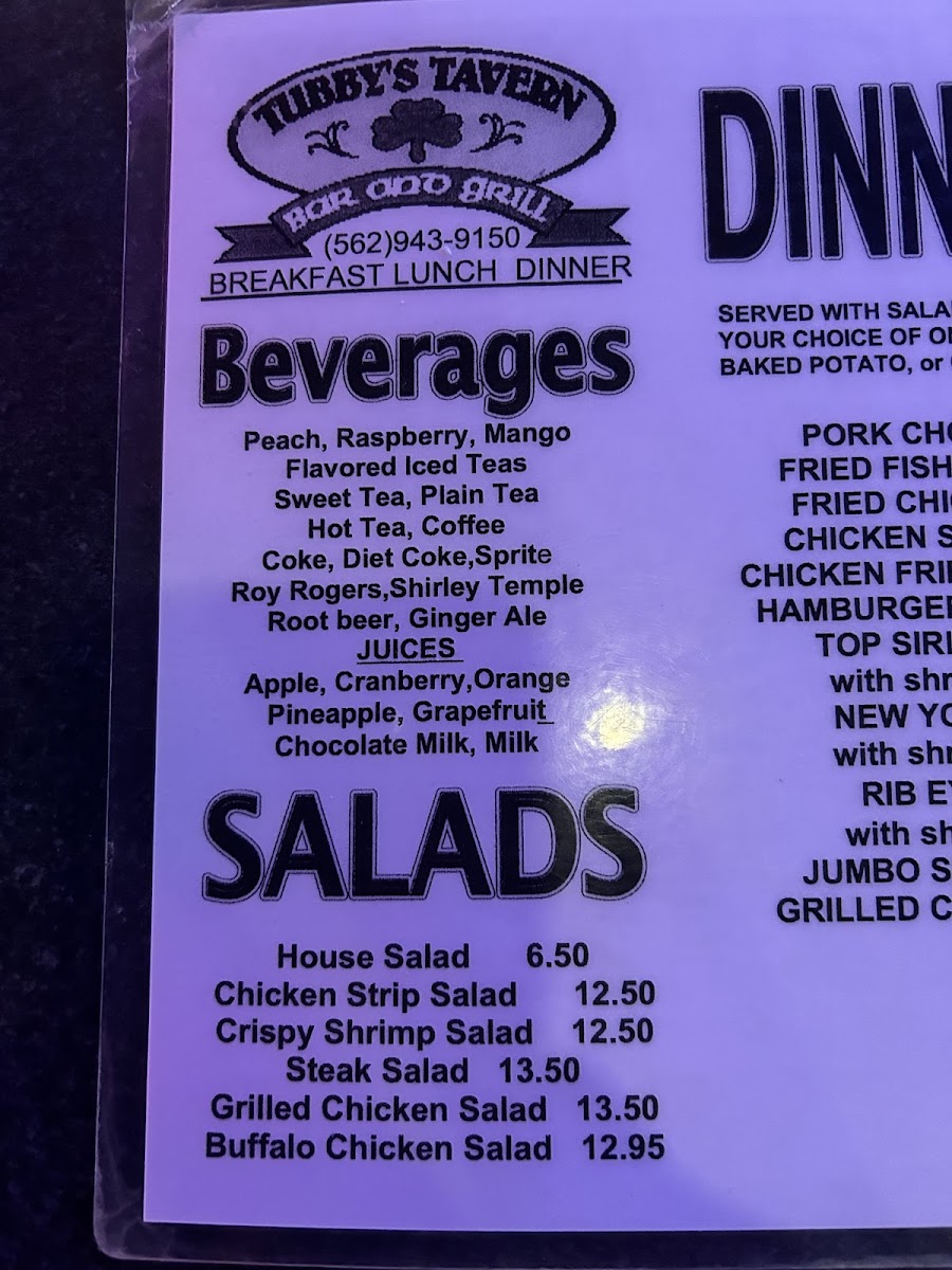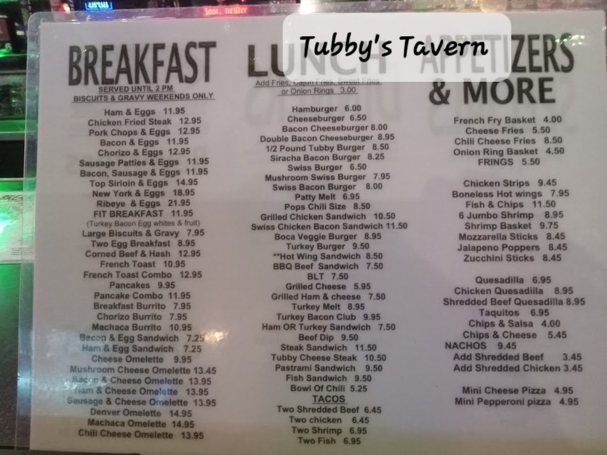 Tubby's Tavern Menu